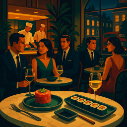 * Jetzt kann Peter das Abendessen mit seinen Freunden im Bar des Prés London genießen!