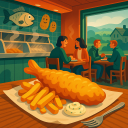 Excellent fish and chips, fish very tasty with a superb crispy batter, chips cooked to perfection. Lovely staff, great service, parking right outside.