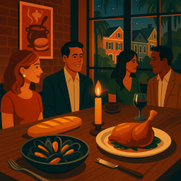 * Jetzt kann Peter das Abendessen mit seinen Freunden im Chez Nous Charleston genießen!
