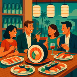 * Jetzt kann Peter das Abendessen mit seinen Freunden im Hane Sushi San Diego genießen!