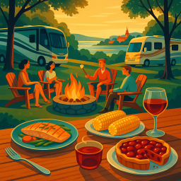 * Jetzt kann Peter das Abendessen mit seinen Freunden im Hearthside Grove Motorcoach Resort Petoskey genießen!