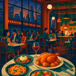 * Jetzt kann Peter das Abendessen mit seinen Freunden im La Serre Chicago genießen!