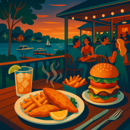 Food was great and the atmosphere was perfect. Right off the lake and a few duck visits. We had the firecracker chicken wrap with chips and bacon cheeseburger and upgraded charge for waffles fries. Restrooms outside and inside. Restrooms were clean.