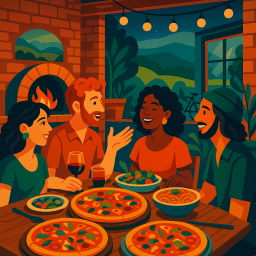 * Jetzt kann Peter das Abendessen mit seinen Freunden im Pizzeria Mercato Carrboro genießen!