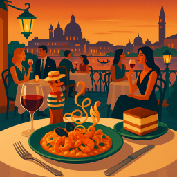 * Jetzt kann Peter das Abendessen mit seinen Freunden im Restaurant Terrazza Danieli Venezia genießen!