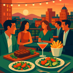 * Jetzt kann Peter das Abendessen mit seinen Freunden im Six and Sky Rooftop Grille Roanoke genießen!
